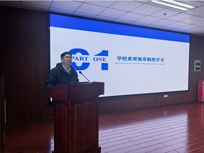 江齐里介绍了学院新引进的教师,并从综合治理、师德师风、意识形态、保密教育、育人教育、党风廉政、实验室安全等七大方面进行了工作部署。院长薛大伟与教职工一起学习了科研诚信、科技成果转化、横向经费管理等学校重要文件,并从2026年国家自然科学基金申报、学科建设、人才引育、学生就业、教学工作、学校“12350”行动等方面进行期末工作部署。