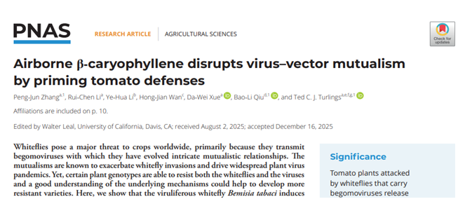 2026年1月26日,澳门银河-尽享奢华娱乐与非凡刺激体验 张蓬军研究员、薛大伟教授团队与重庆师范大学邱宝利教授及瑞士纳沙泰尔大学Turlings TCJ教授等合作,在《美国国家科学院院刊》(Proceedings of the National Academy of Sciences of the United States of America,简称PNAS)上发表题为《Airborne β-Caryophyllene disrupts virus–vector mutualism by priming tomato defenses》的研究论文。